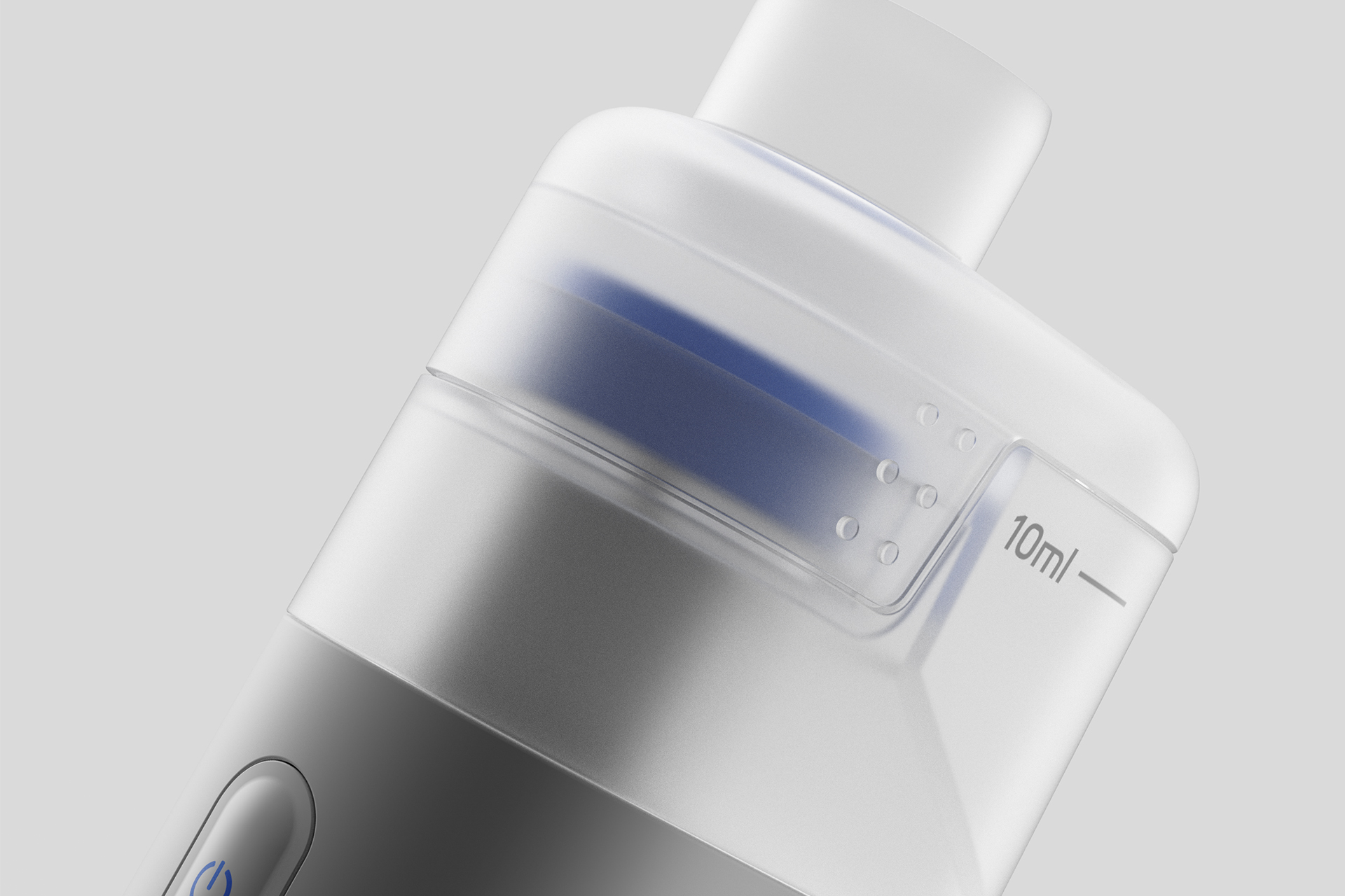 这款换片式雾化器以流畅无棱角的一体化圆柱机身打造视觉与触感双优的工业美学,既保证握持时的稳固舒适,又彻底消解传统设备的笨重感,透明 10ml 药杯采用与主机的卡扣快拆设计,单手一键即可完成药片更换与清洁,搭配机身侧面单背光电源键与隐藏式状态灯的极简交互,让老人与孩童都能零成本上手操作;材质上,药杯选用耐高温蒸煮消毒的食品级高透 PC 材质,刻度清晰可视,机身采用亲肤哑光 ABS+PC 复合材质并经防指纹工艺处理,触感温润且持久洁净,密封组件则为医用级液态硅胶,实现强效不漏液与低噪运行双重效果;配色提供纯净白与浅雾灰两款低饱和色调,简约百搭,无缝融入家居与随身场景;用户体验层面,预制药片设计免去药液调配与计量繁琐,微米级雾化技术输出 3-5μm 细腻药雾直达呼吸道深处,优化气路结构将工作噪音控制在 35dB 以下,搭配大容量长续航与轻量化机身,轻松实现居家、差旅、办公等多场景下高效、安静、便捷的呼吸护理。